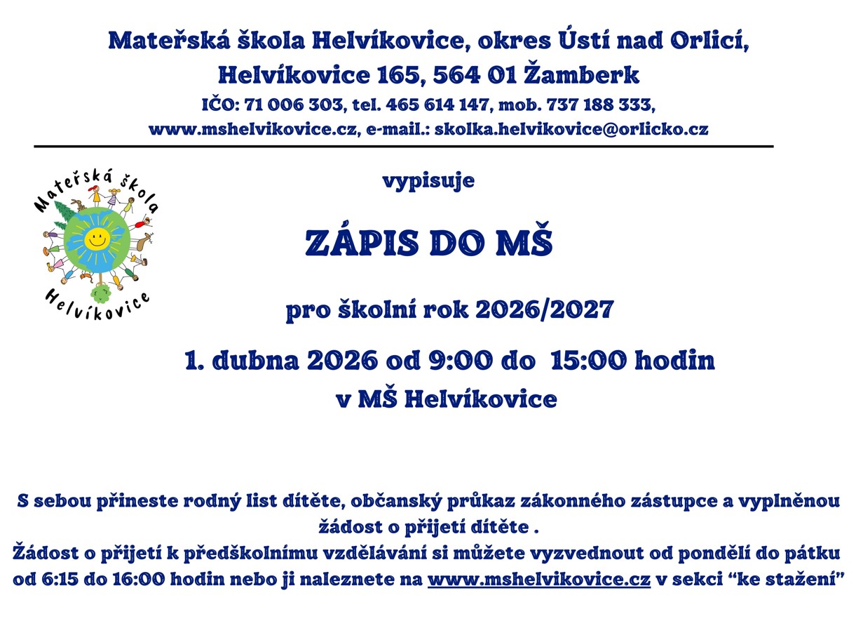 Mateřská škola Helvíkovice vypisuje Zápis pro školní rok 2026/2027 1.dubna 2026 od 9h do 15h v MŠ Helvíkovice.